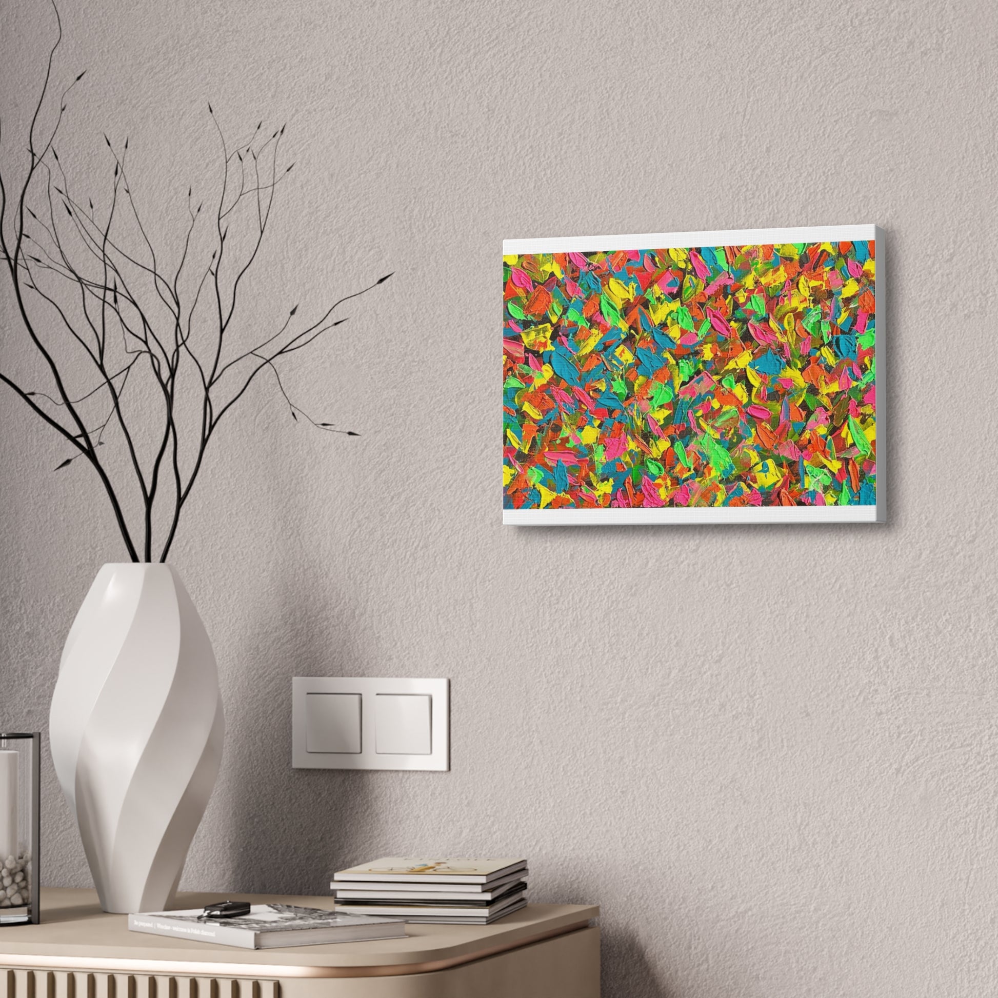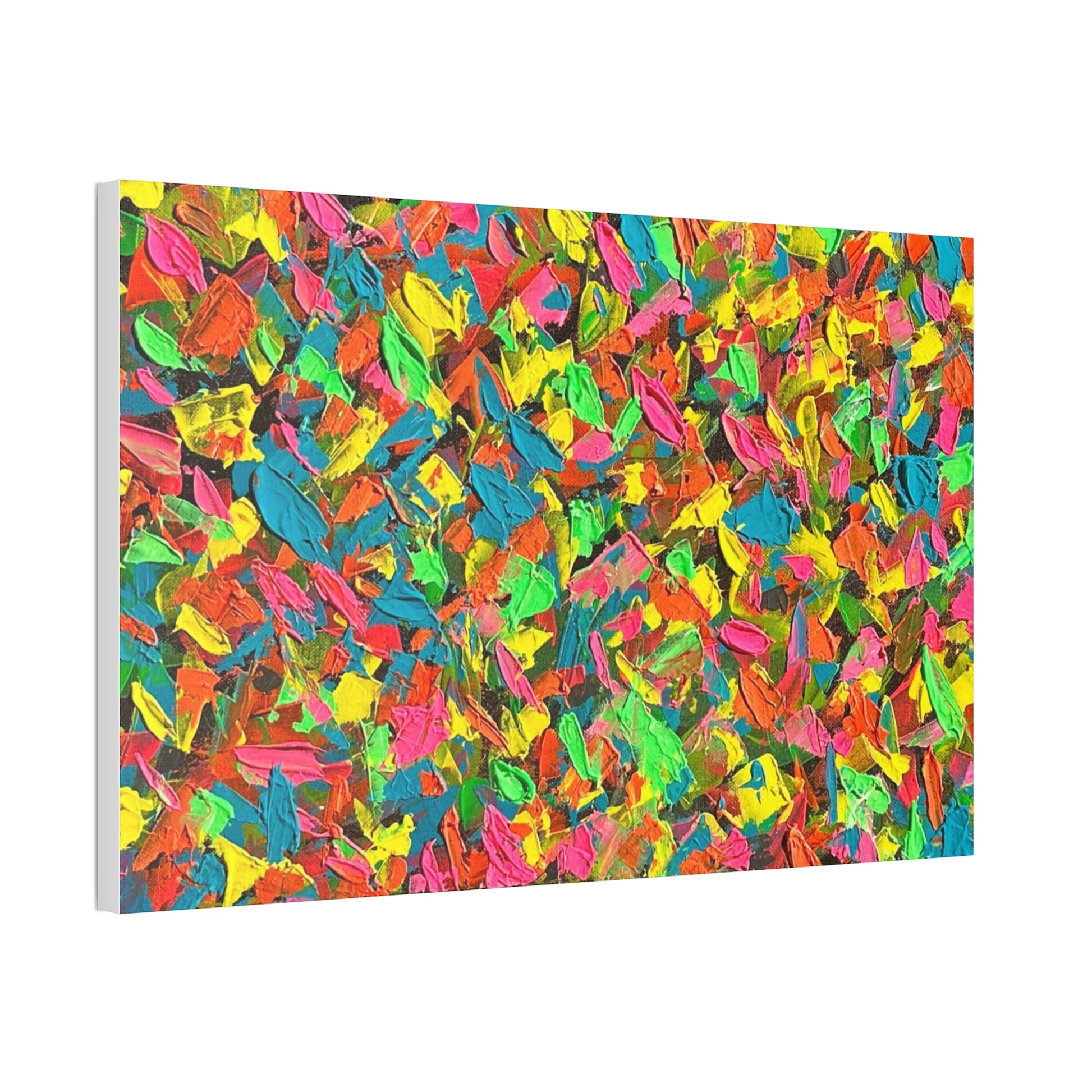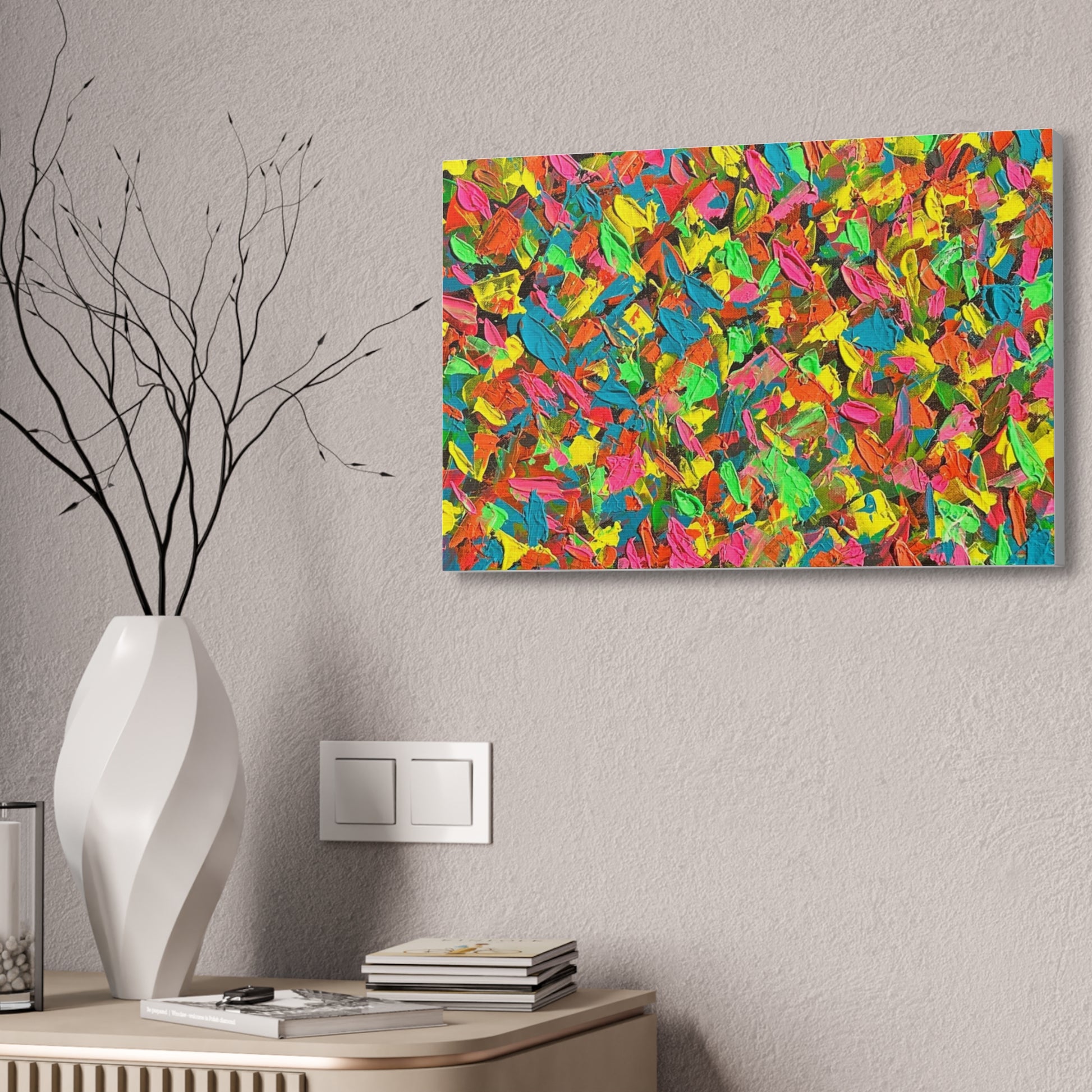 This stretched canvas brings an explosion of color into any room. A dense, confetti-like band of neon pinks, greens, yellows and blues runs across a clean white field, creating a modern, energetic focal point. The semi-gloss polyester surface makes each hue pop while the hand-stretched fabric over a sturdy pine frame keeps the composition crisp and gallery-ready. Hung above a console, sofa, or in a hallway, it adds playful movement and a lived-in artistic vibe that suits bold, contemporary interiors.