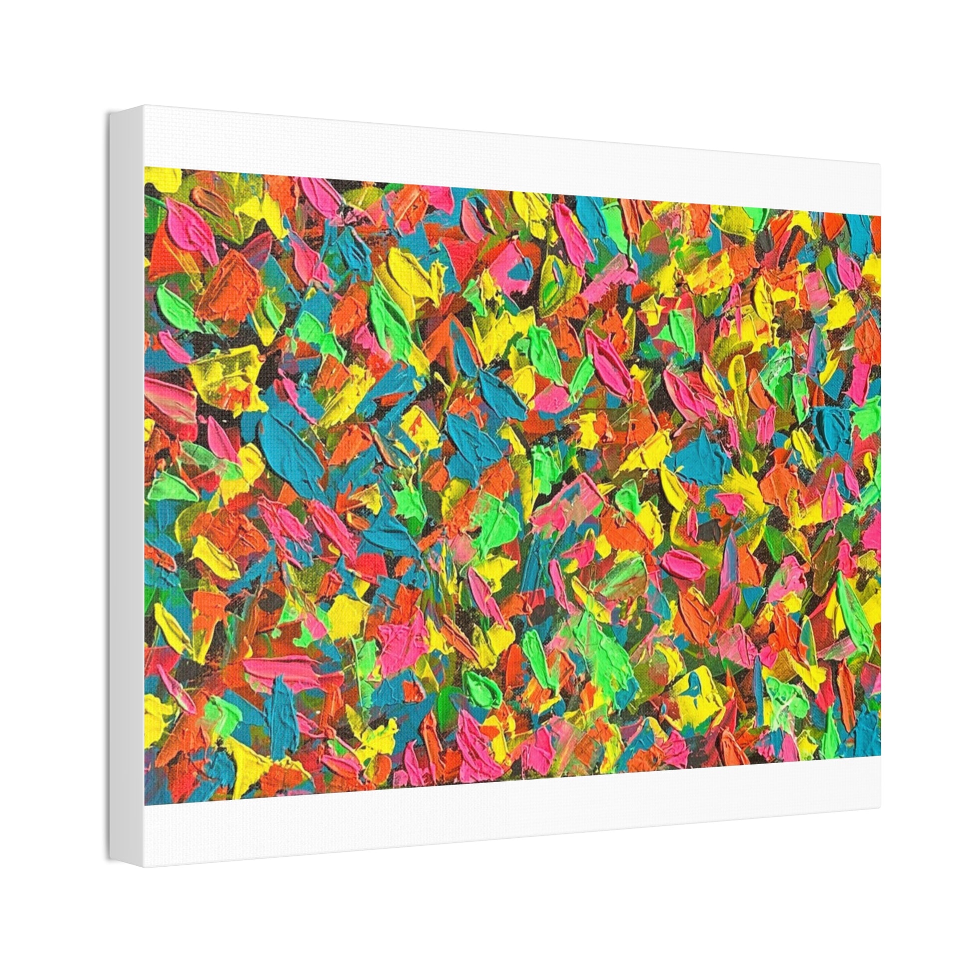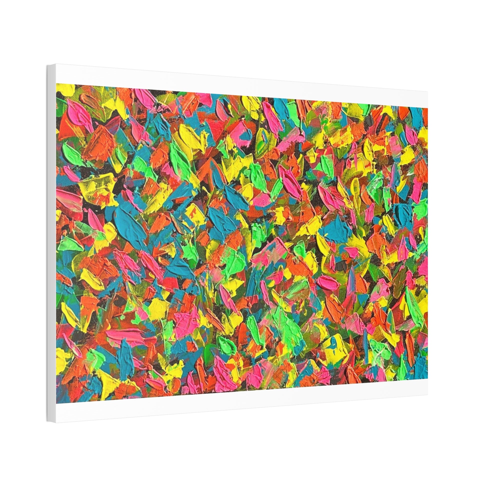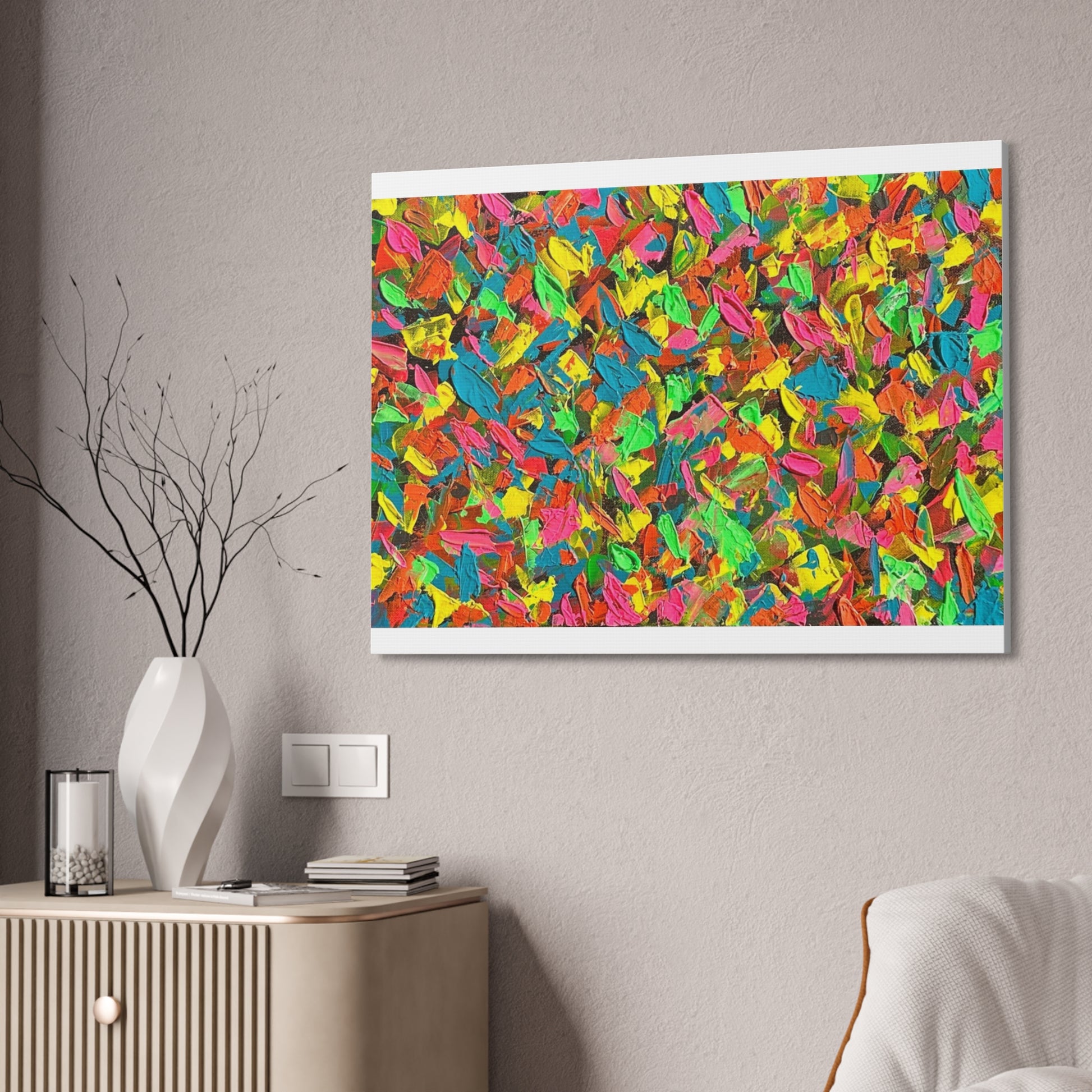This stretched canvas brings an explosion of color into any room. A dense, confetti-like band of neon pinks, greens, yellows and blues runs across a clean white field, creating a modern, energetic focal point. The semi-gloss polyester surface makes each hue pop while the hand-stretched fabric over a sturdy pine frame keeps the composition crisp and gallery-ready. Hung above a console, sofa, or in a hallway, it adds playful movement and a lived-in artistic vibe that suits bold, contemporary interiors.