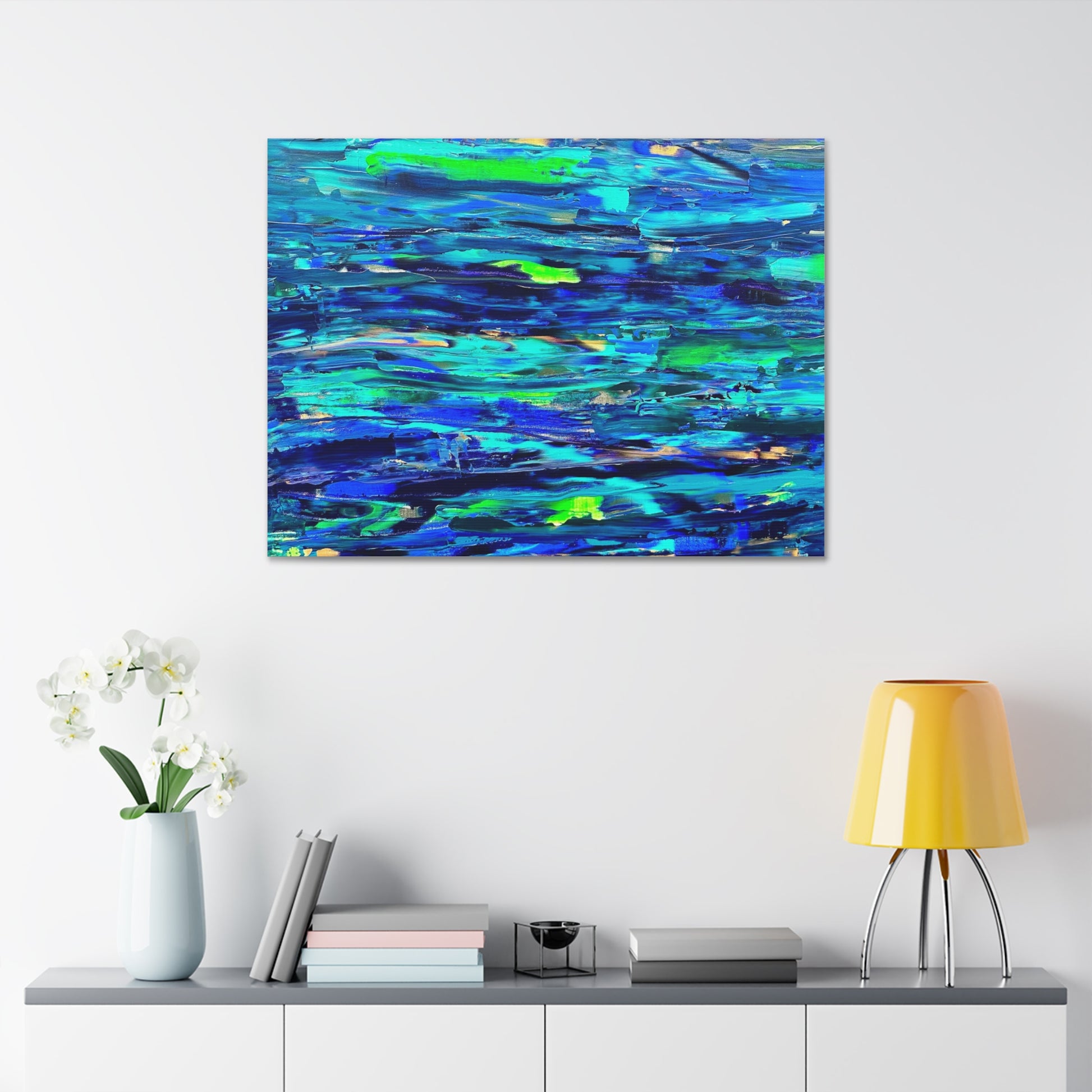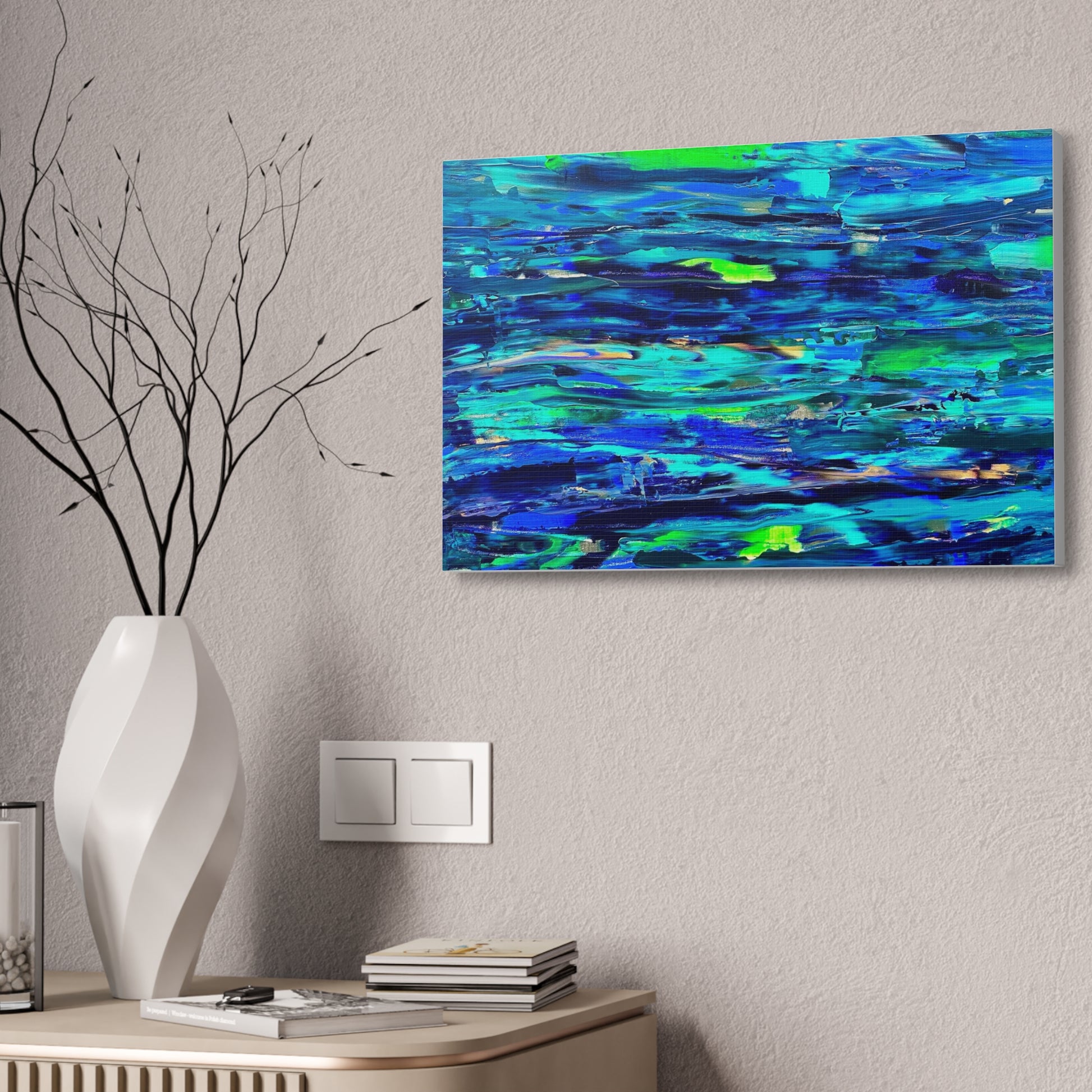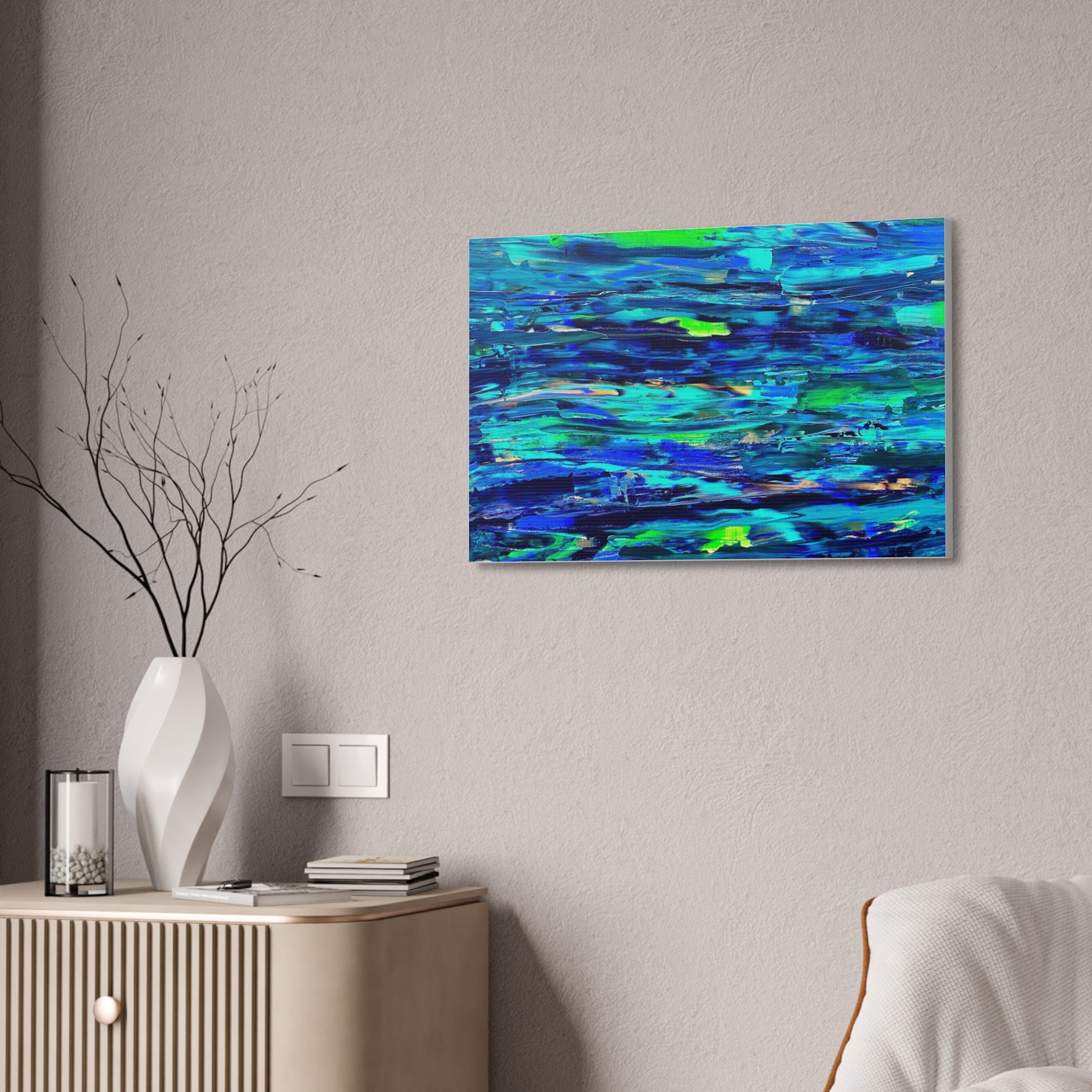 A vibrant stretched canvas that brings the motion and glow of deep water into any room. Broad, painterly strokes of cobalt, teal and neon chartreuse ripple across a semi-gloss polyester surface, catching light and pulling the eye. It's hand-stretched over a sturdy pinewood frame so the painted flow continues around the edges, ready to hang straight from the included hardware. Place it above a mid-century console, in a bathroom with matte tile, or on a gallery wall to introduce color and movement. The canvas feels alive — like standing at the shore and watching tides shift — and suits someone who lives for bold color, texture, and a modern, collected home.