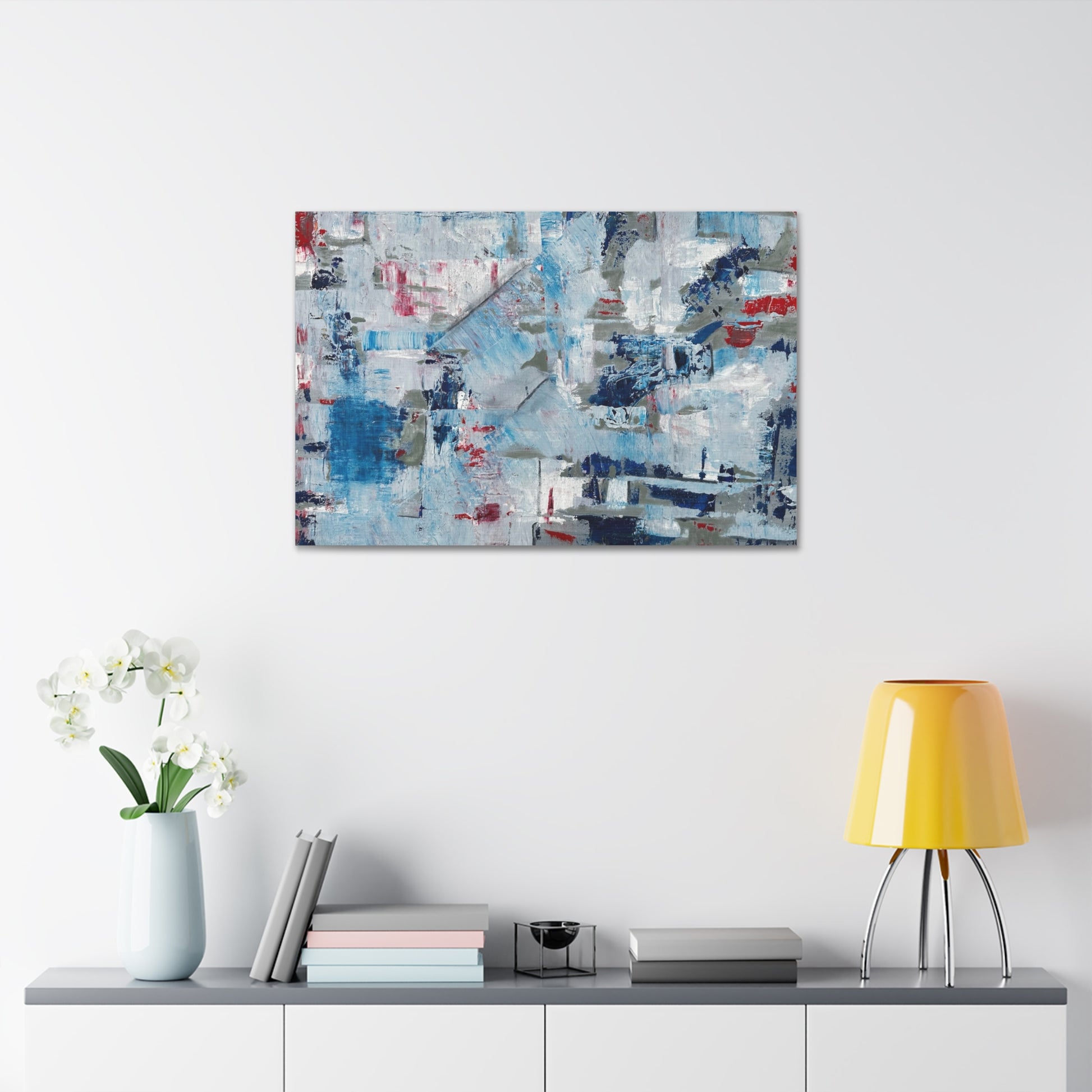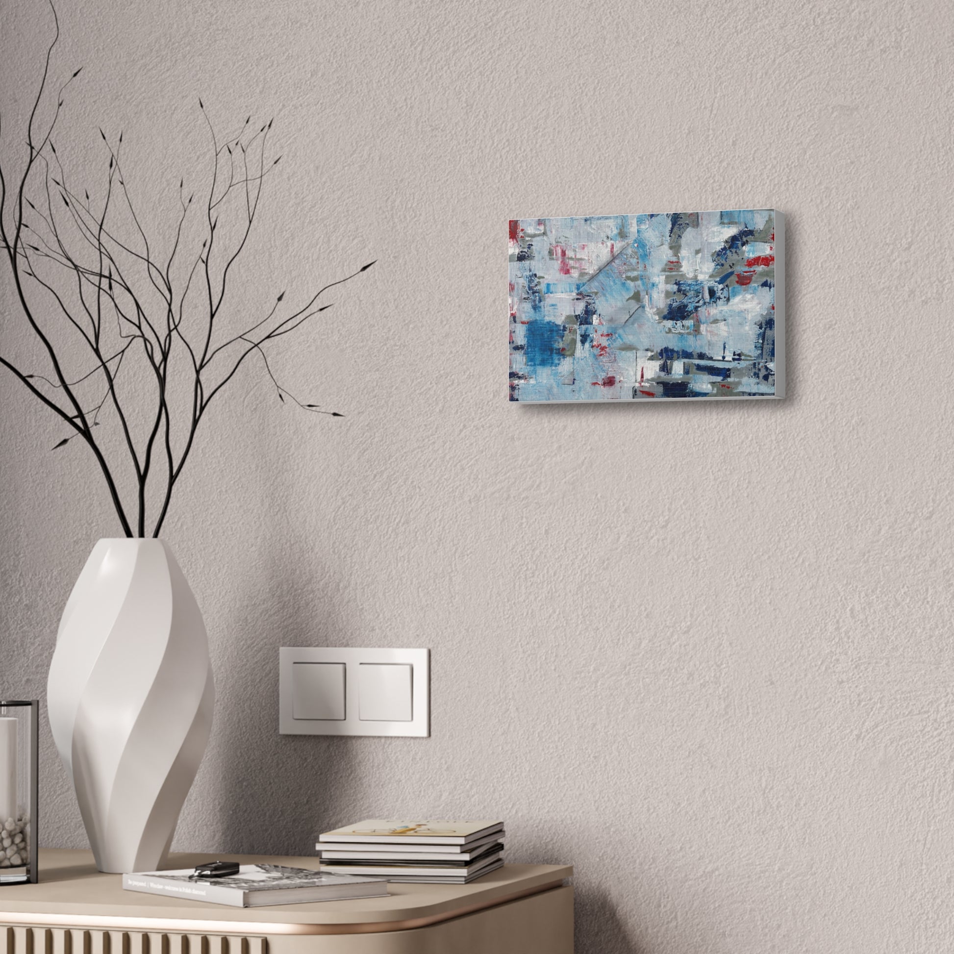 - Hand-stretched 100% polyester canvas on 1.5" pine stretcher bars